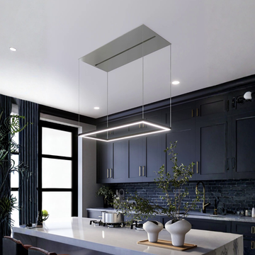 The Kite Rangehood is an offboard ceiling cassette with silver trim and a pendant light that's sleek,...