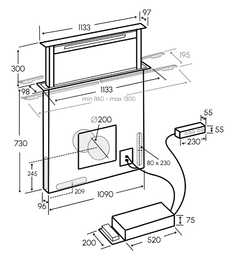 W1133 x D97 x H730 below counter